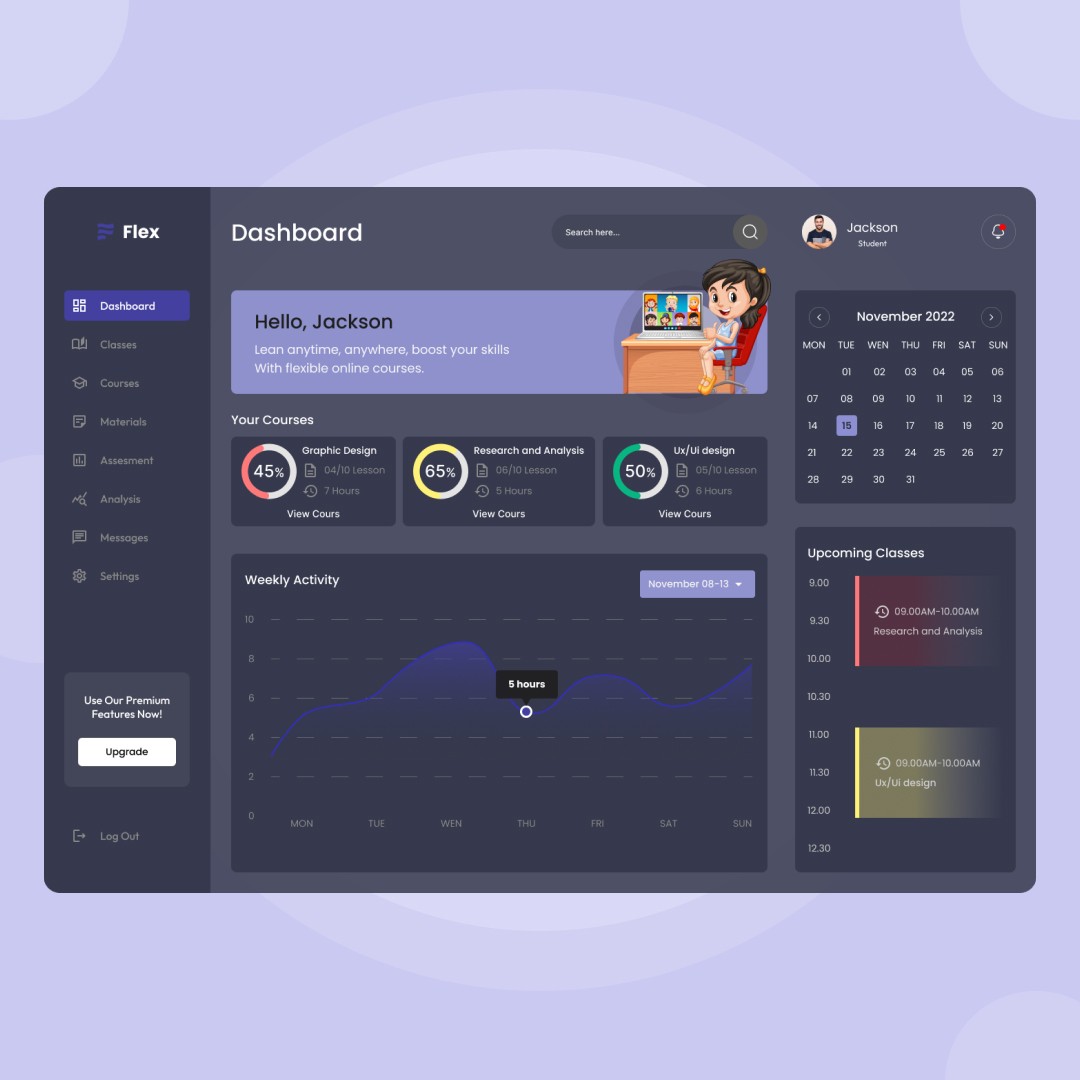 This project focuses on designing a Learning Management System (LMS) Dashboard that helps students track their learning progress, manage courses, and stay organized in one place. The dashboard is designed to provide a clear overview of enrolled courses, progress percentages, weekly activity, and upcoming classes.